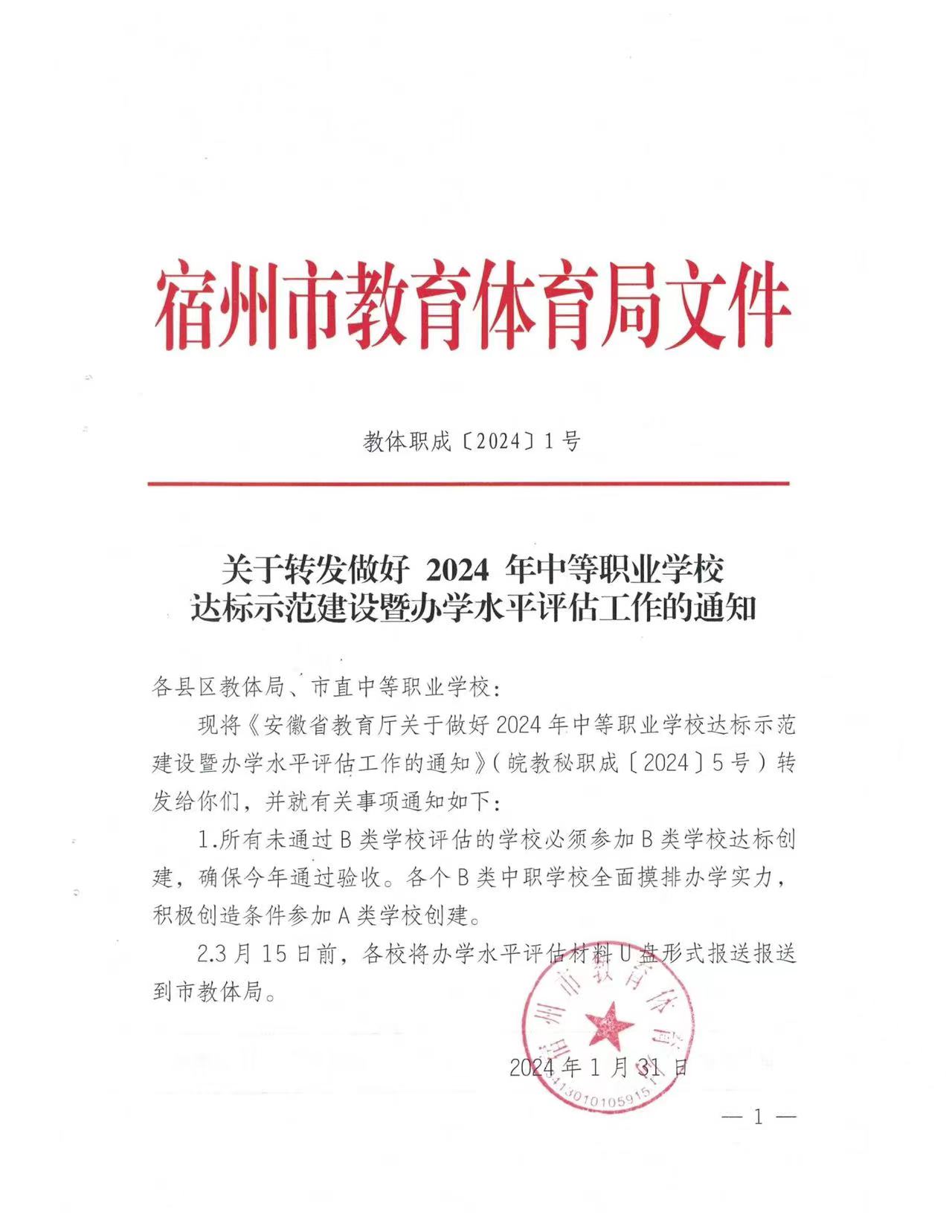 宿州市藝文中專關(guān)于轉(zhuǎn)發(fā)做好2024年中等職業(yè)學(xué)校達標示范建設(shè)暨辦學(xué)水平評估工作的通知