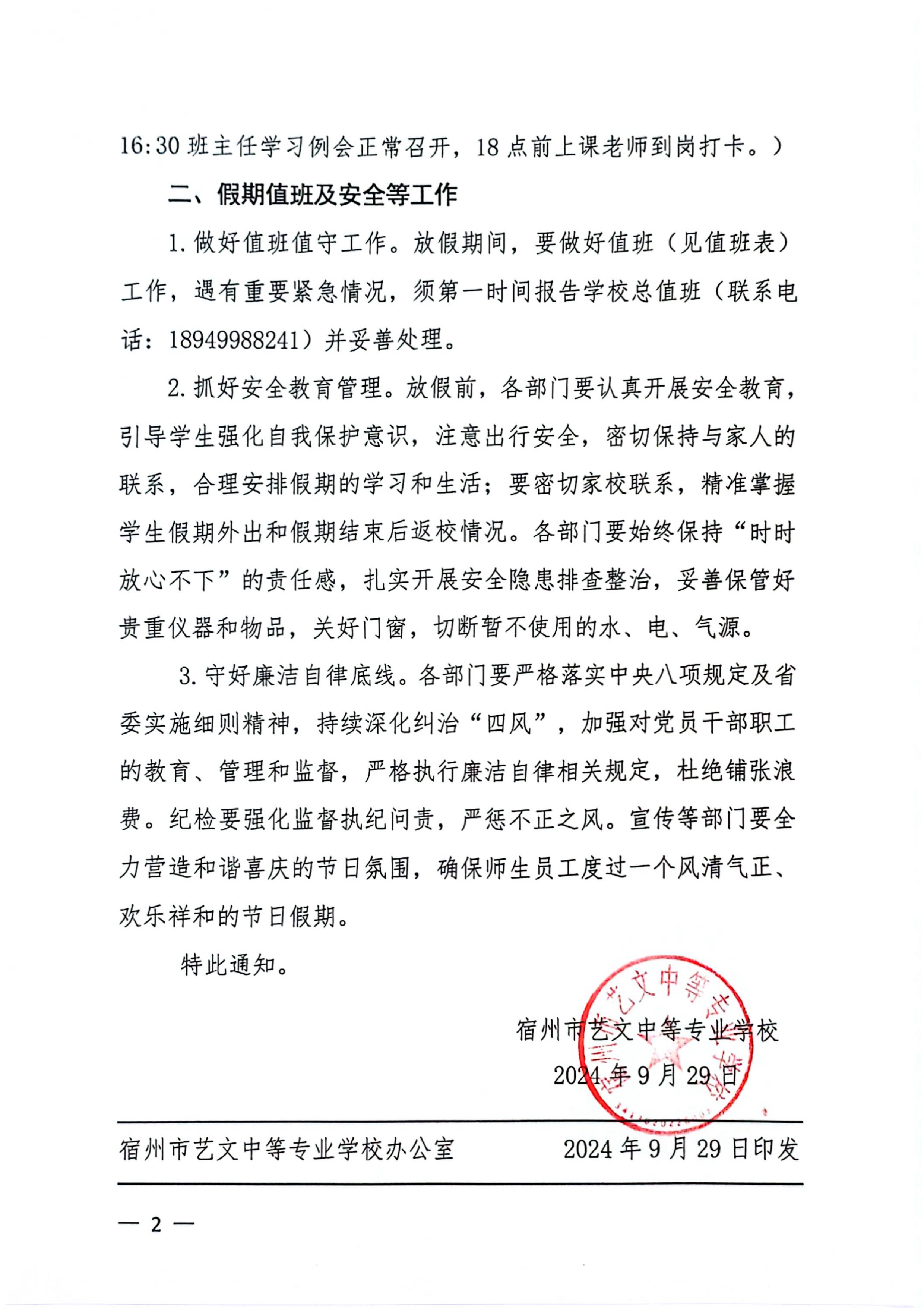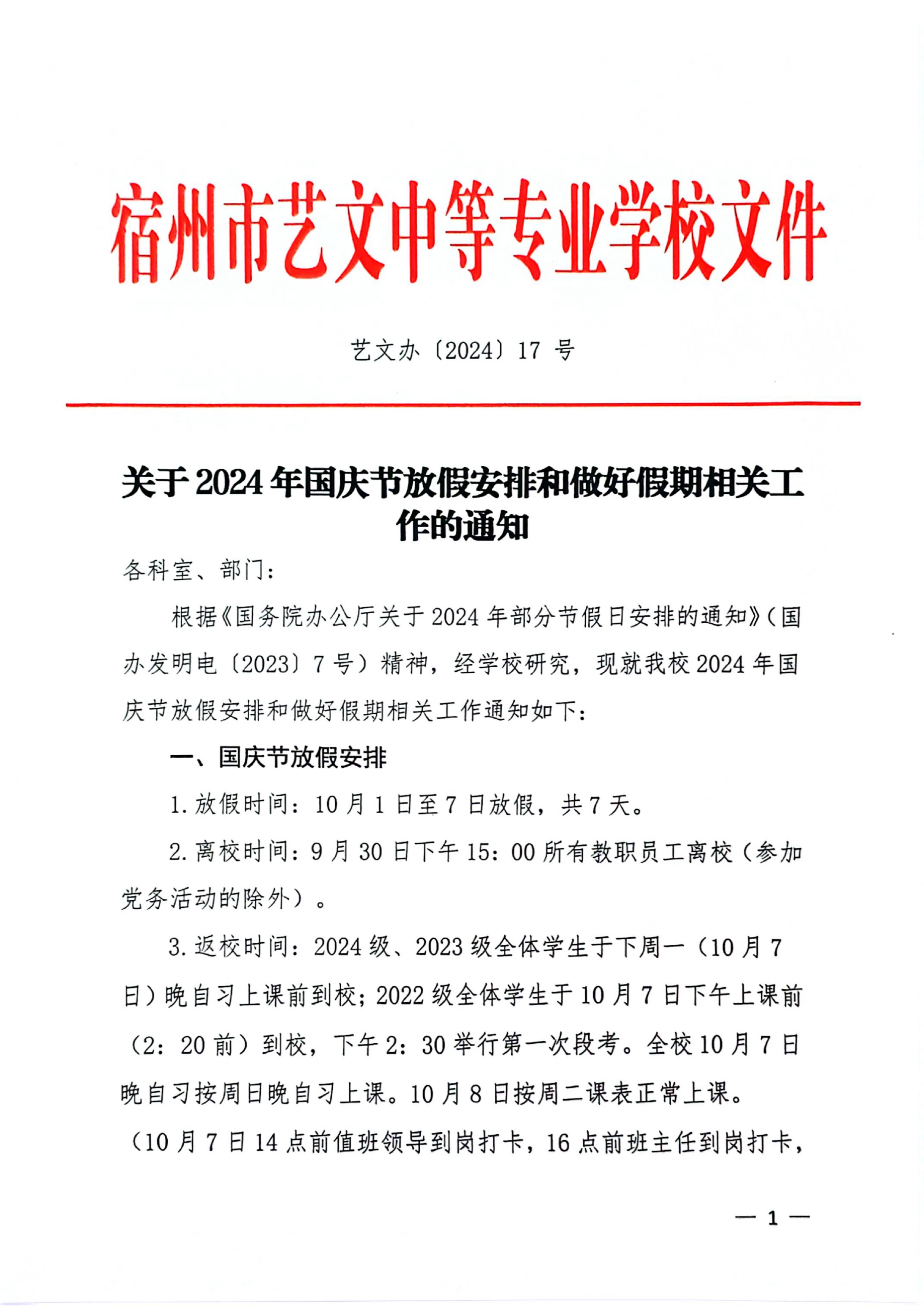 關(guān)于2024年國慶節(jié)放假安排和做好假期相關(guān)工作的通知