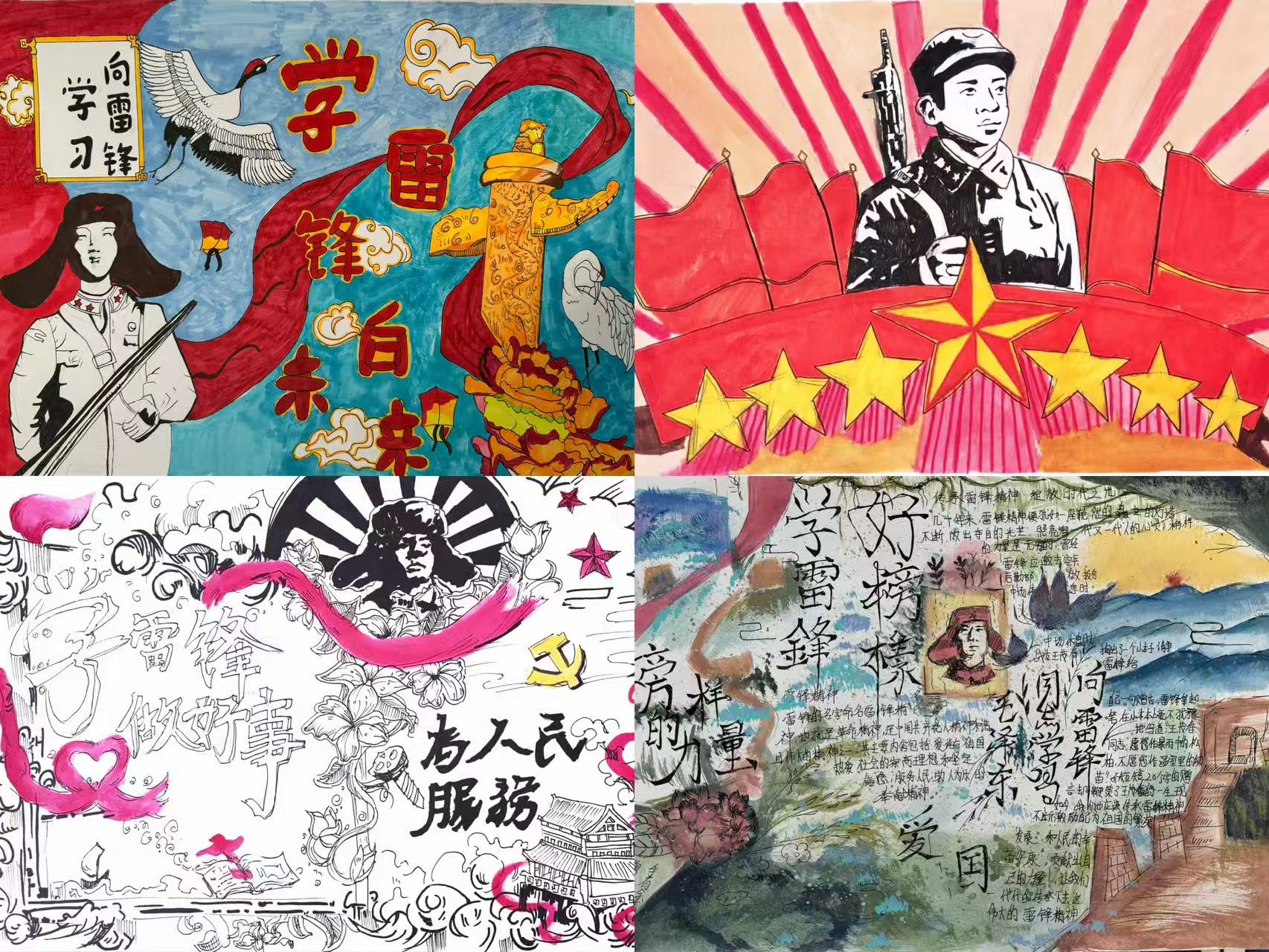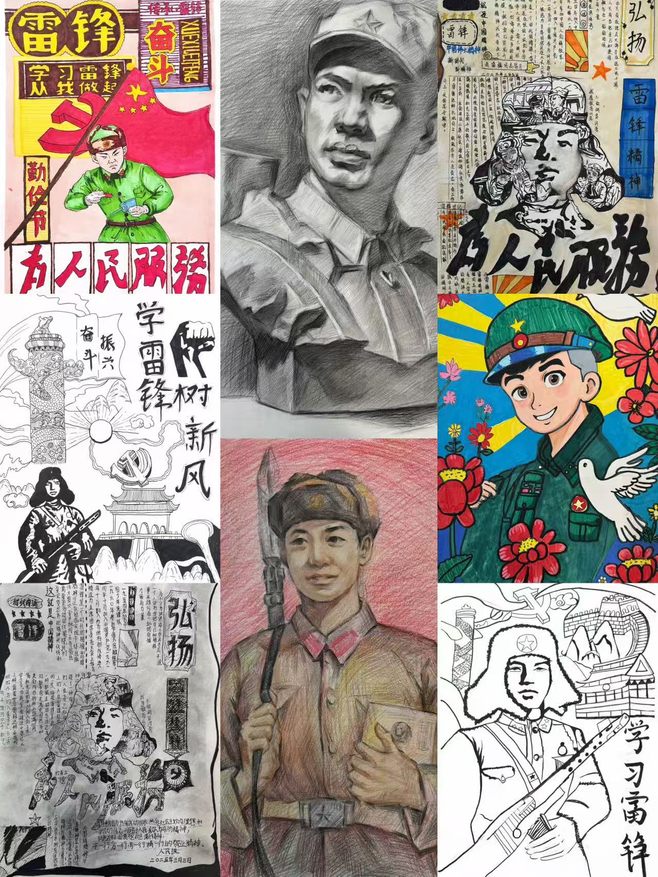 美術組發(fā)起的“鋒行畫卷”主題創(chuàng)作大賽,圍繞“雷鋒故事”“身邊微光”“公益行動”三大方向,激發(fā)學生創(chuàng)作熱情。200余件作品涵蓋素描、剪紙、彩繪等形式,以細膩筆觸展現(xiàn)雷鋒事跡、捕捉生活溫暖瞬間。這些作品在校園內(nèi)形成藝術長廊,師生駐足欣賞,讓大家在藝術的熏陶中深化對雷鋒精神的理解。