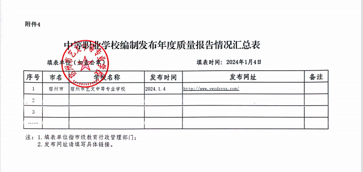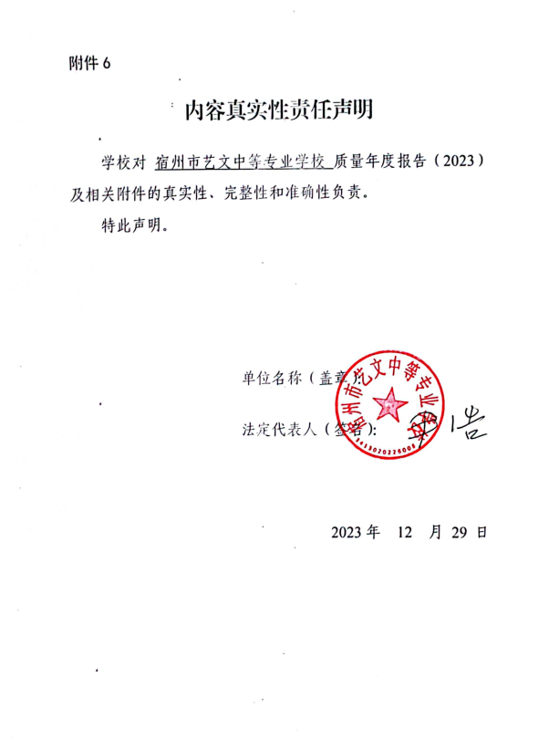 為進(jìn)一步推動學(xué)校高質(zhì)量發(fā)展,學(xué)校編制了《宿州市藝文中等專業(yè)學(xué)校 2023 年教育質(zhì)量年度報(bào)告》(以下簡稱質(zhì)量年報(bào))。學(xué)校于 2023 年 10 月啟動質(zhì)量年報(bào)編制工作,2023年 11 月初,學(xué)校組織召開質(zhì)量年報(bào)編制專題部署會,對編制主要內(nèi)容、部門分工以及進(jìn)度作了詳細(xì)安排。在學(xué)校各部門共同努力下,于 2023 年 12 月10日完成初稿,12月16日提交校委會、支部會審議通過。